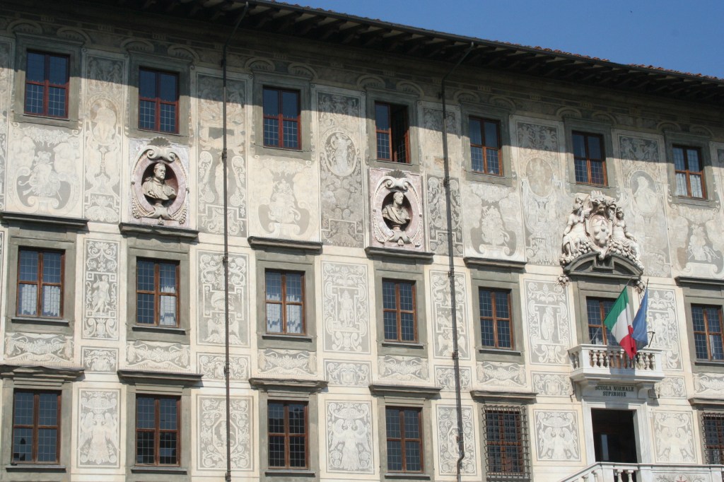 Rond het plein staan verschillende gebouwen en ik vond Palazzo della Carovana het bijzonderst. Het werd gebouwd tussen 1562 en1564 door Giorgio Vasari als hoofdkwartier van de Ridders van Sint-Stefanus. Op de gevel staat een complex ontwerp met
