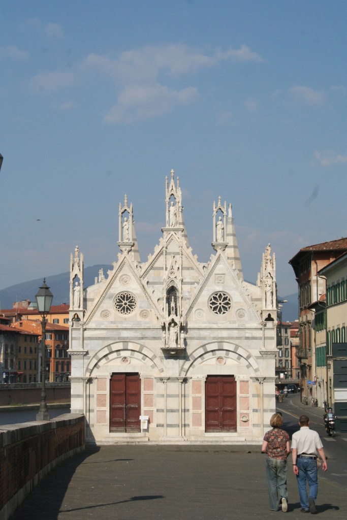 De Santa Maria della Spina is een van de schattigste kerkjes die ik ken. Oorspronkelijk was het een bidkapel en werd in 1323 uitgebouwd tot een kerkje in de stijl van Pisaanse gotiek. Het moest ook dienstdoen als reliekschrijn, waarin een ‘spina’ of doorn uit de doornenkroon van Jezus bewaard werd. De spina wordt nu niet meer in het kerkje bewaard.